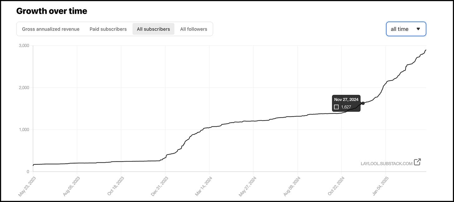 At the time of this email, I had 1,600 subscribers. Today, I have 3,000. Both of those numbers fall into the 10-25% of all Substack newsletters, and with a 60% open rate I am sure I am closer to the 10%. Majority of newsletters have 300-500 Subscribers. Because building a newsletter requires endless persistence and self-coaching.
