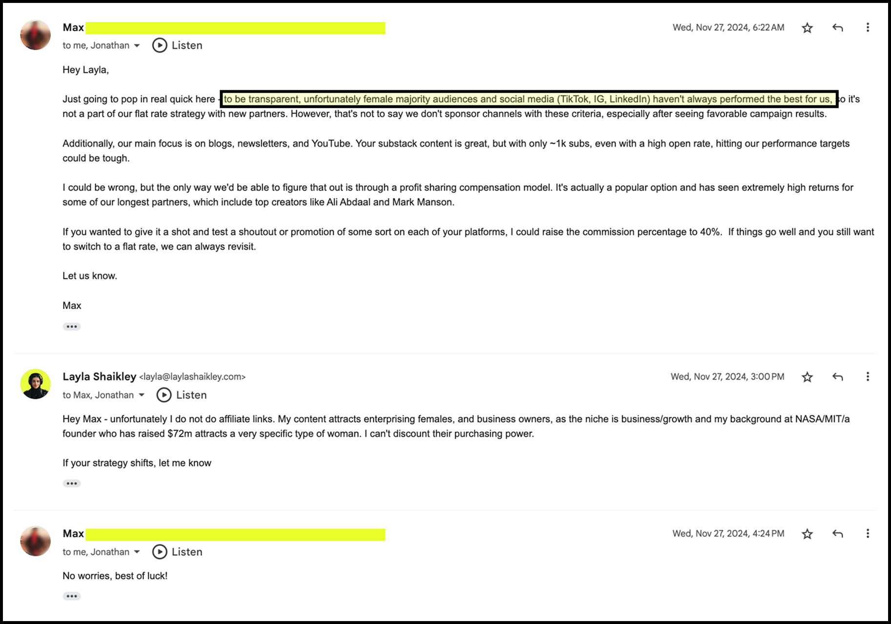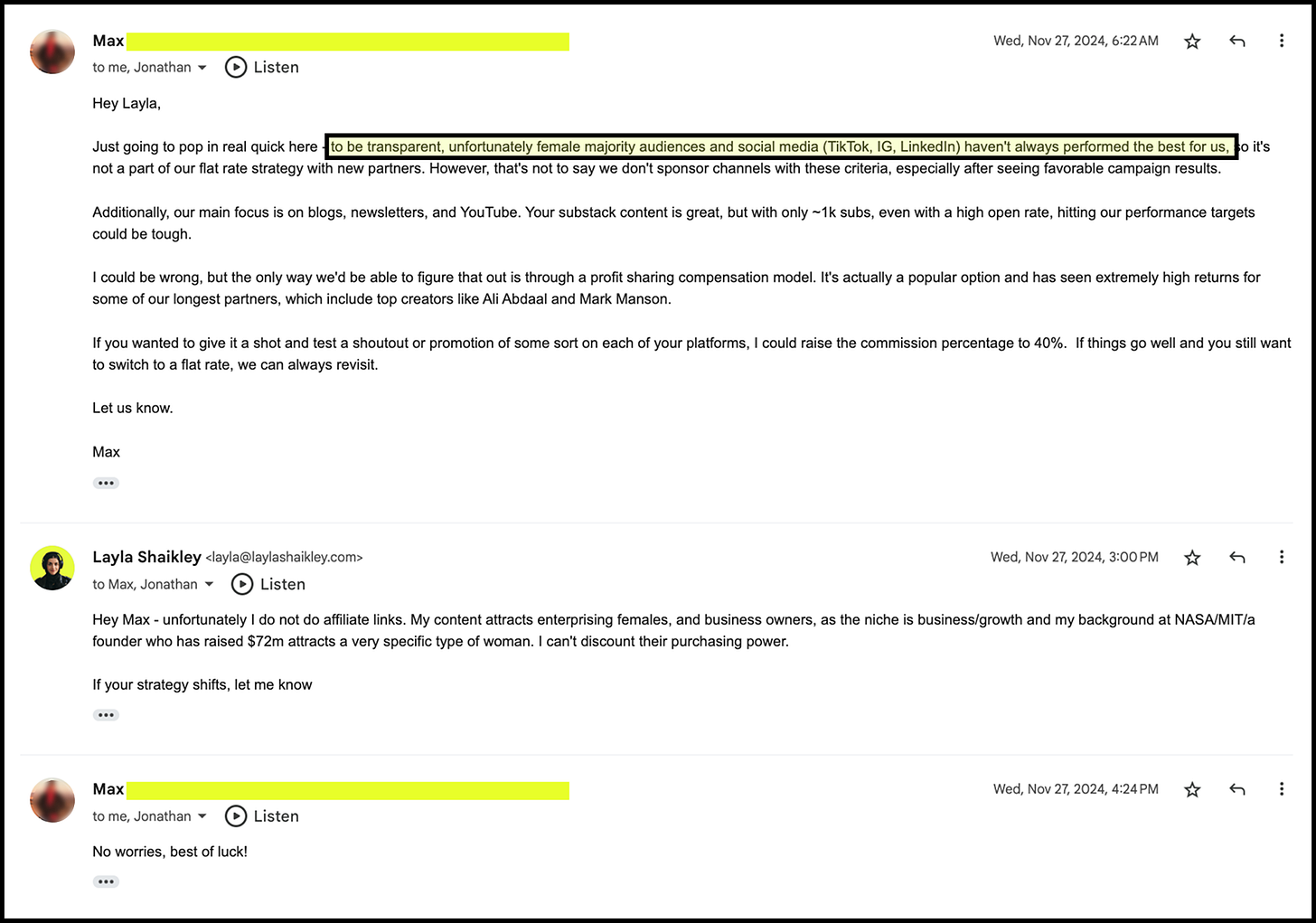 Meet Max. This one is a favorite. Let’s share the exchange then analyze strategy #1: narratives about competence and effectiveness. I have an outreach strategy (pretty much fully automated/through VAs — if you guys want more info, comment and lmk) to work with brands. I generally work with a handful of SaaS or productivity brands a year. Usually on a recurring basis. Usually stuff I already use. I reached out to a learning brand, and got initial interest before Max popped in real quick to let me know that they don’t target women. 51% of the population. It is worth noting that women by 50% of the products marketed to men.
