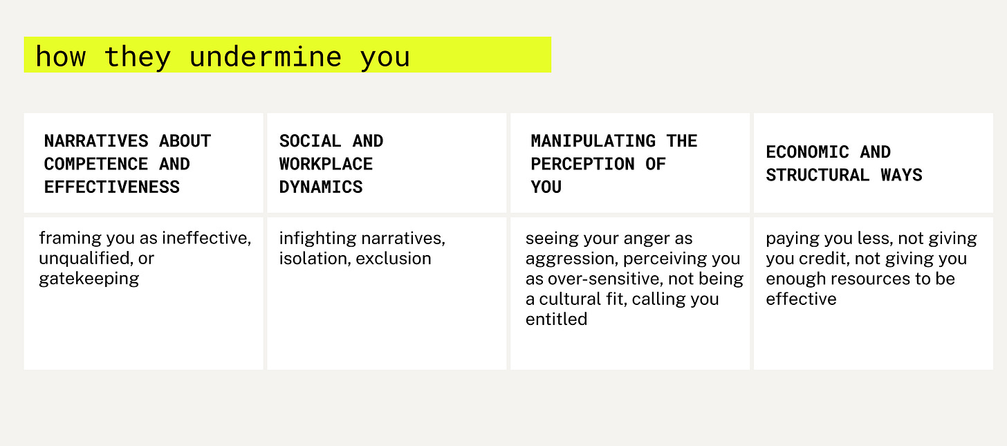 Manipulating the perception of you (seeing your anger as aggression, perceiving you as over-sensitive, not being a cultural fit, calling you entitled)